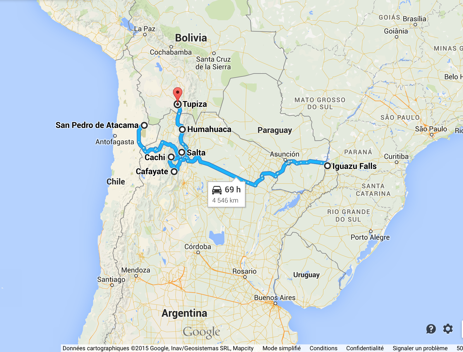 Voici notre parcours depuis le Chili jusqu’a Tupiza en Bolivie ou nous avions rendezvous un peu plus tard avec mes parents  🙂